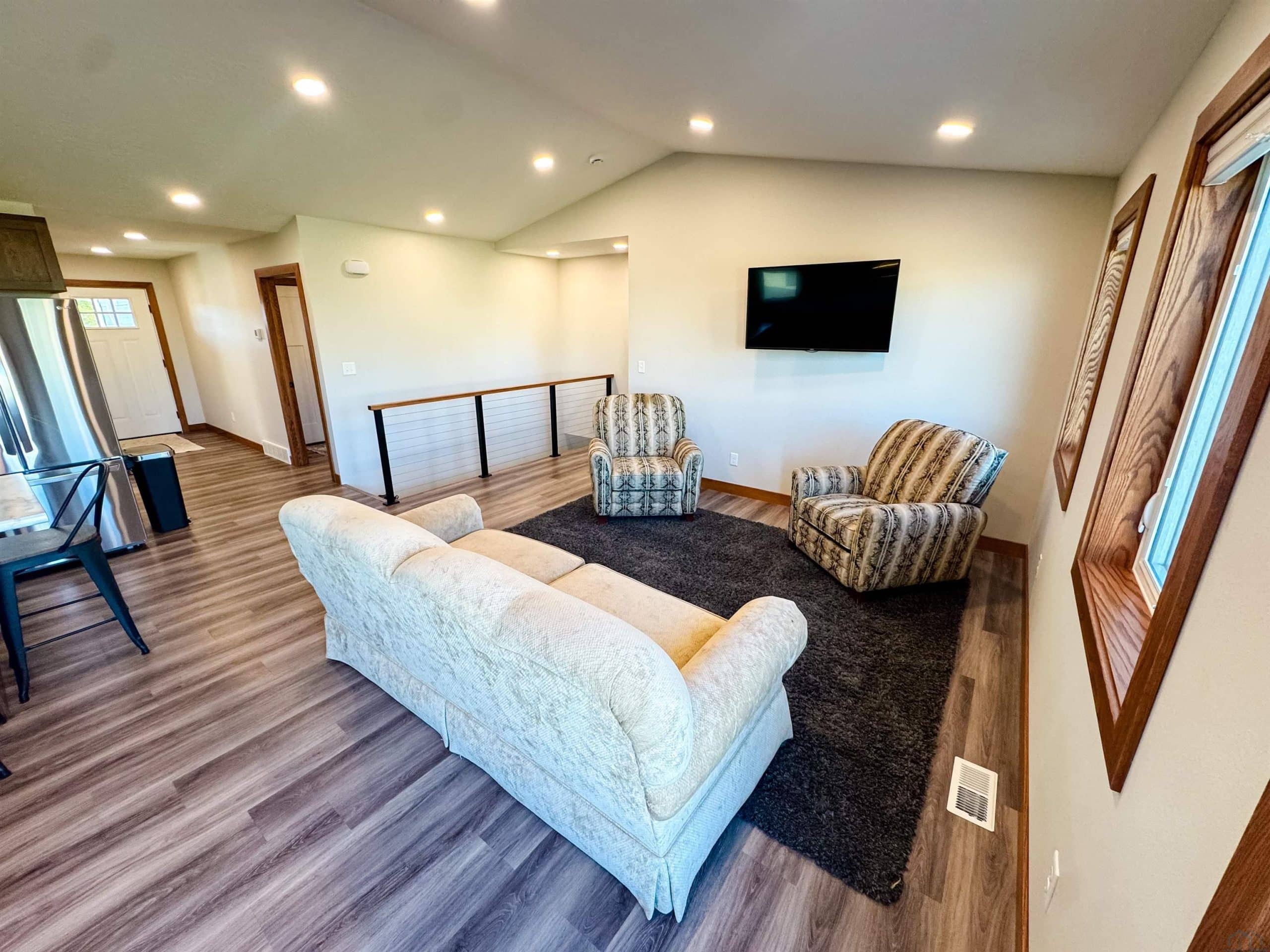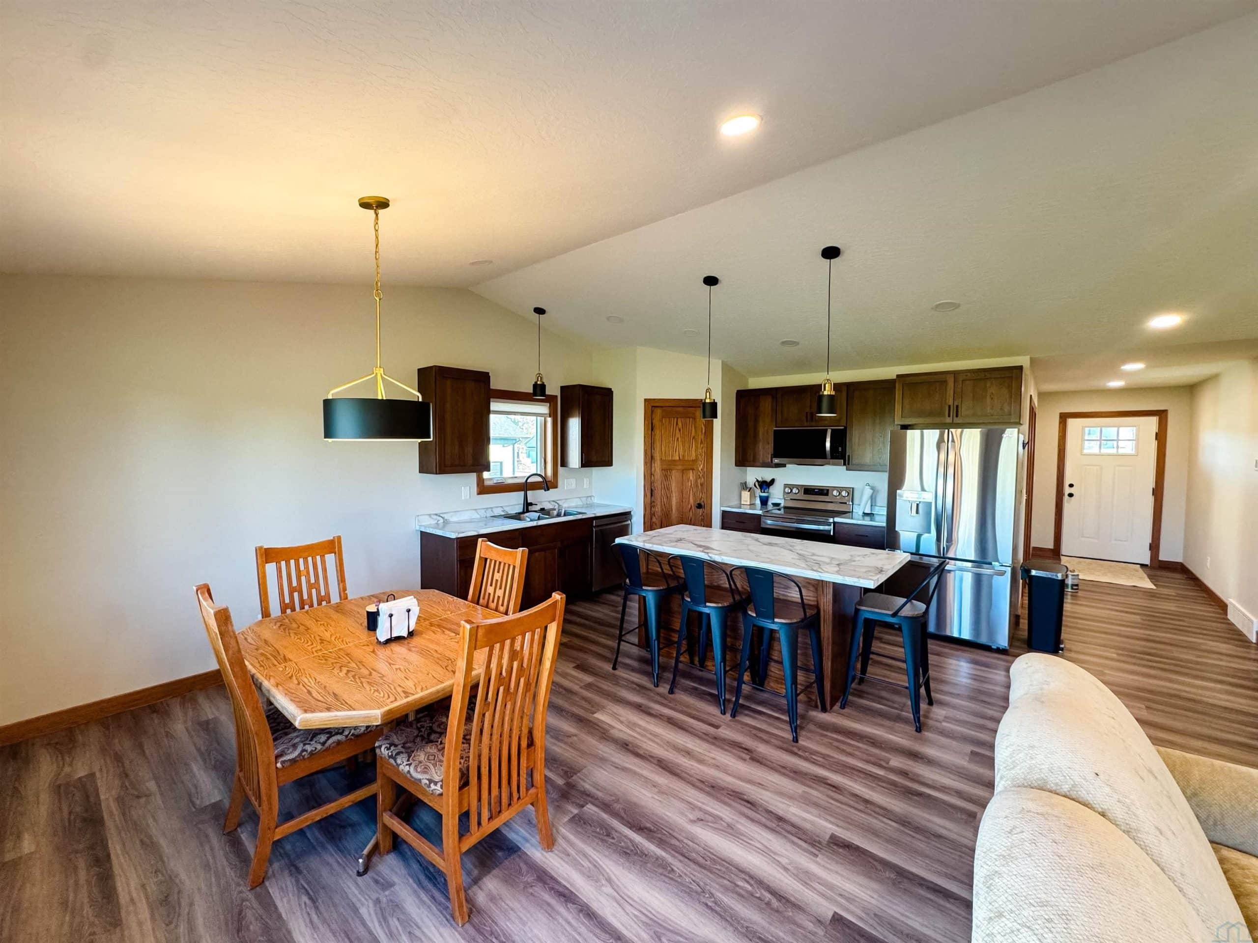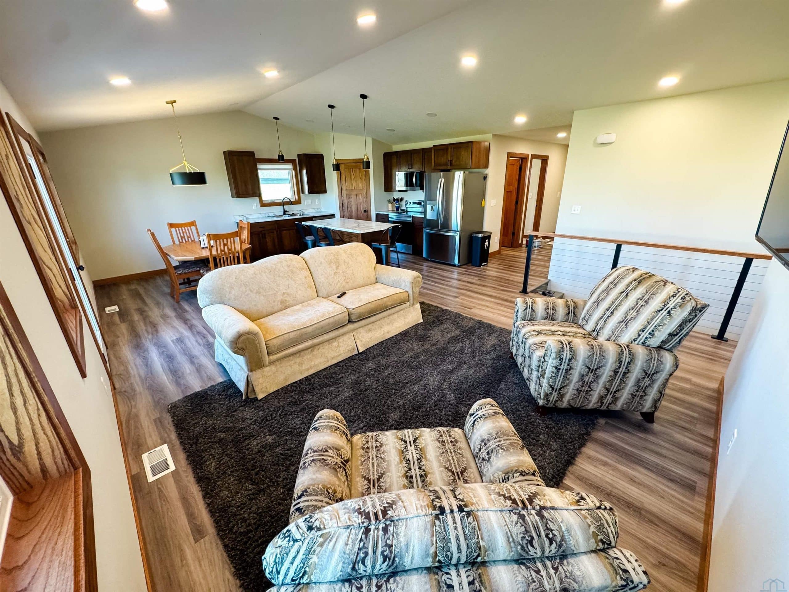 Custom-built in 2023, this beautiful 2-bedroom, 2-bath home offers modern design and spacious living throughout. The primary suite features an en suite bathroom with a tiled shower, double vanity, and walk-in closet. The open-concept kitchen, dining, and living area includes 9-foot ceilings and a vaulted living room ceiling, creating a bright and inviting space filled with natural light. The lower level is framed for an additional 2 bedrooms, 1 bathroom, and a second living space, offering excellent potential for future expansion. Outside, enjoy a nice backyard with a fire pitâperfect for entertaining or relaxing. All appliances are included.