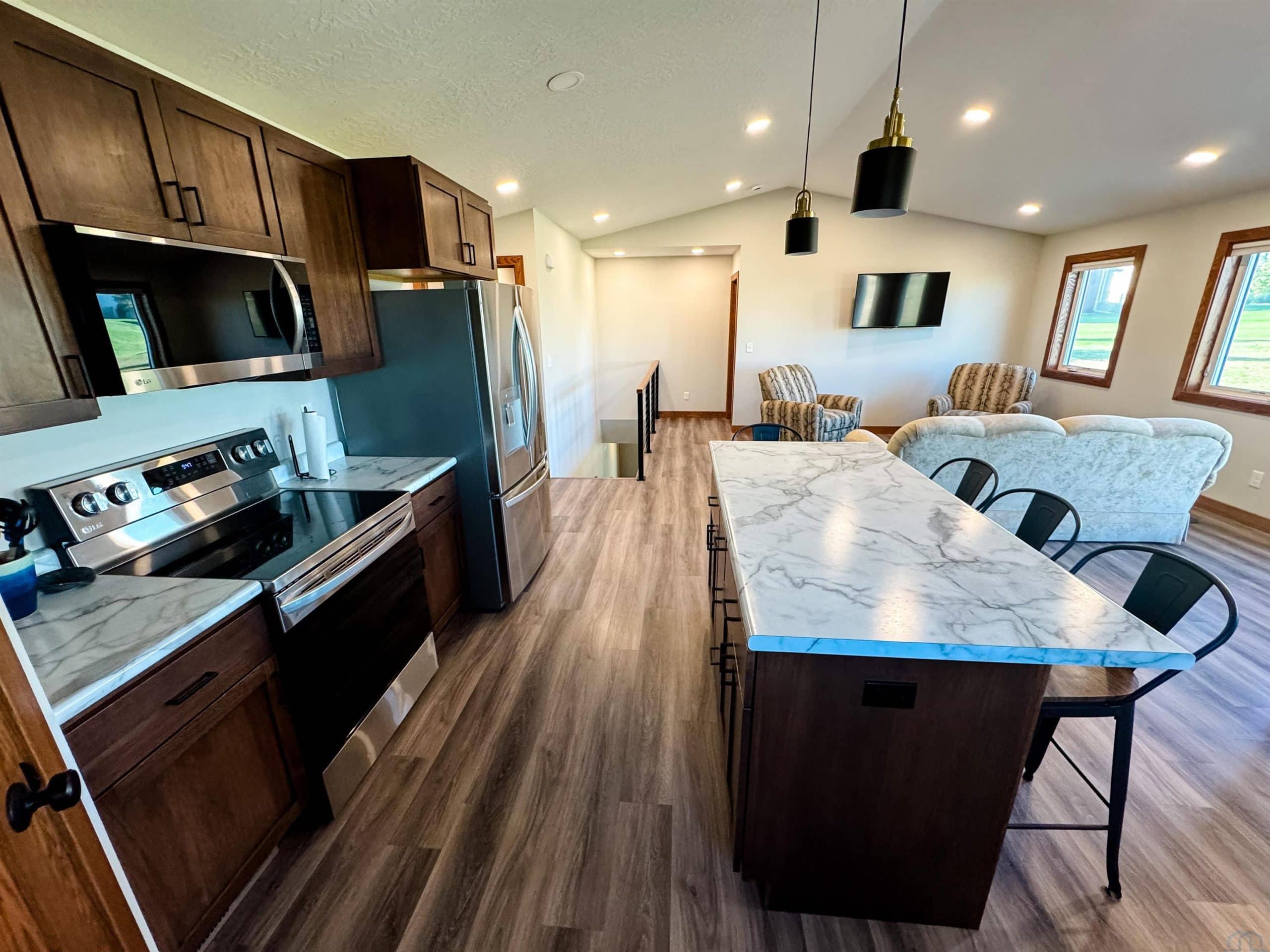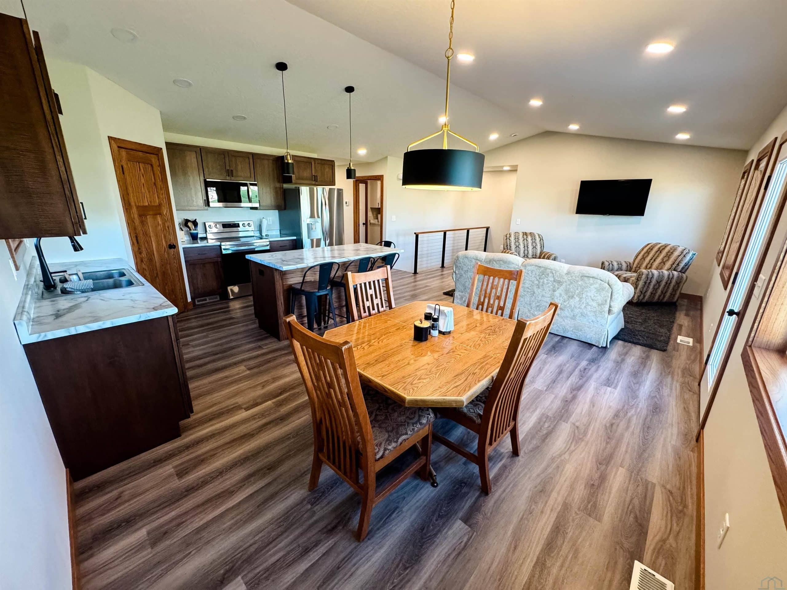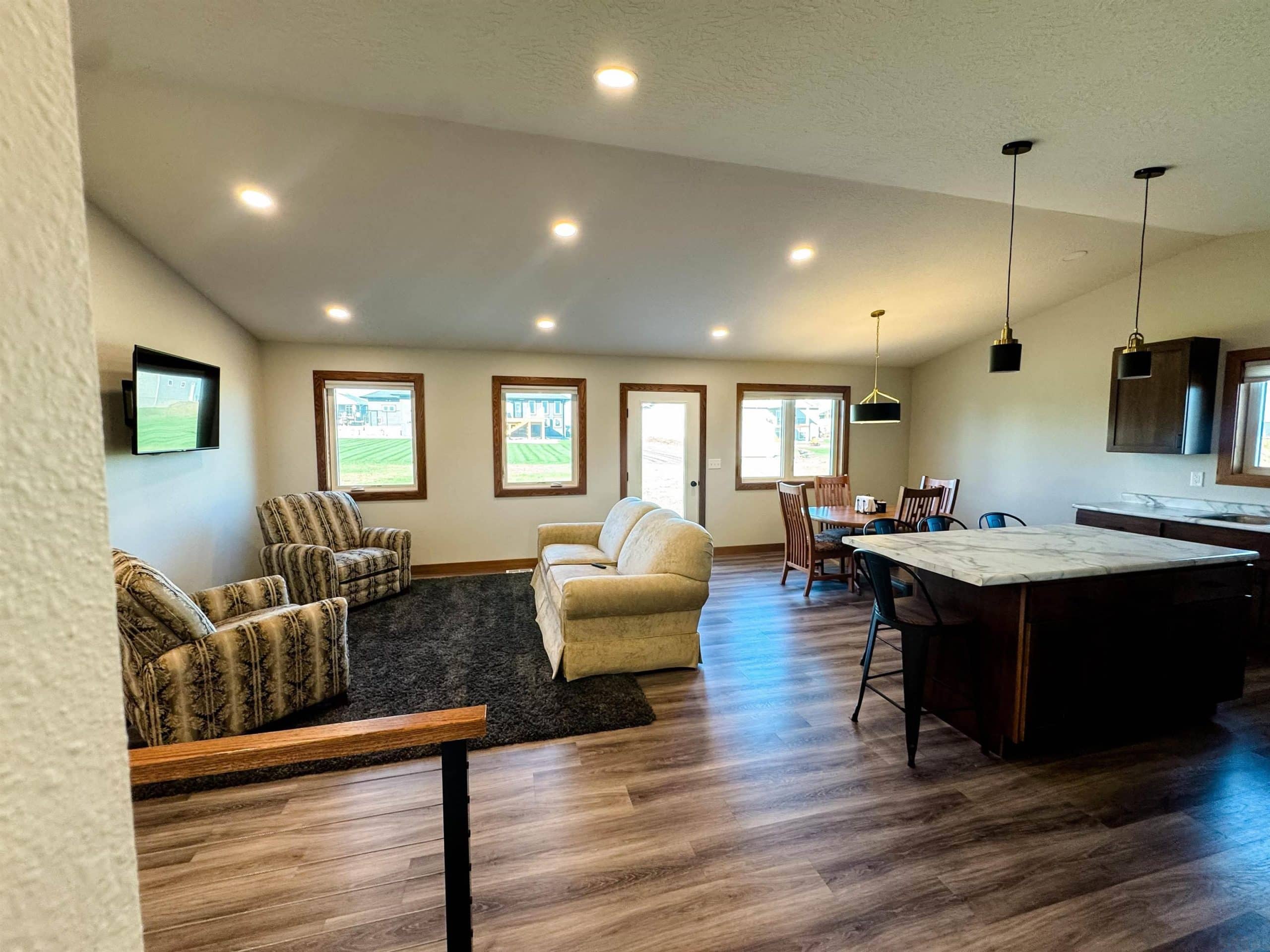 Custom-built in 2023, this beautiful 2-bedroom, 2-bath home offers modern design and spacious living throughout. The primary suite features an en suite bathroom with a tiled shower, double vanity, and walk-in closet. The open-concept kitchen, dining, and living area includes 9-foot ceilings and a vaulted living room ceiling, creating a bright and inviting space filled with natural light. The lower level is framed for an additional 2 bedrooms, 1 bathroom, and a second living space, offering excellent potential for future expansion. Outside, enjoy a nice backyard with a fire pitâperfect for entertaining or relaxing. All appliances are included.