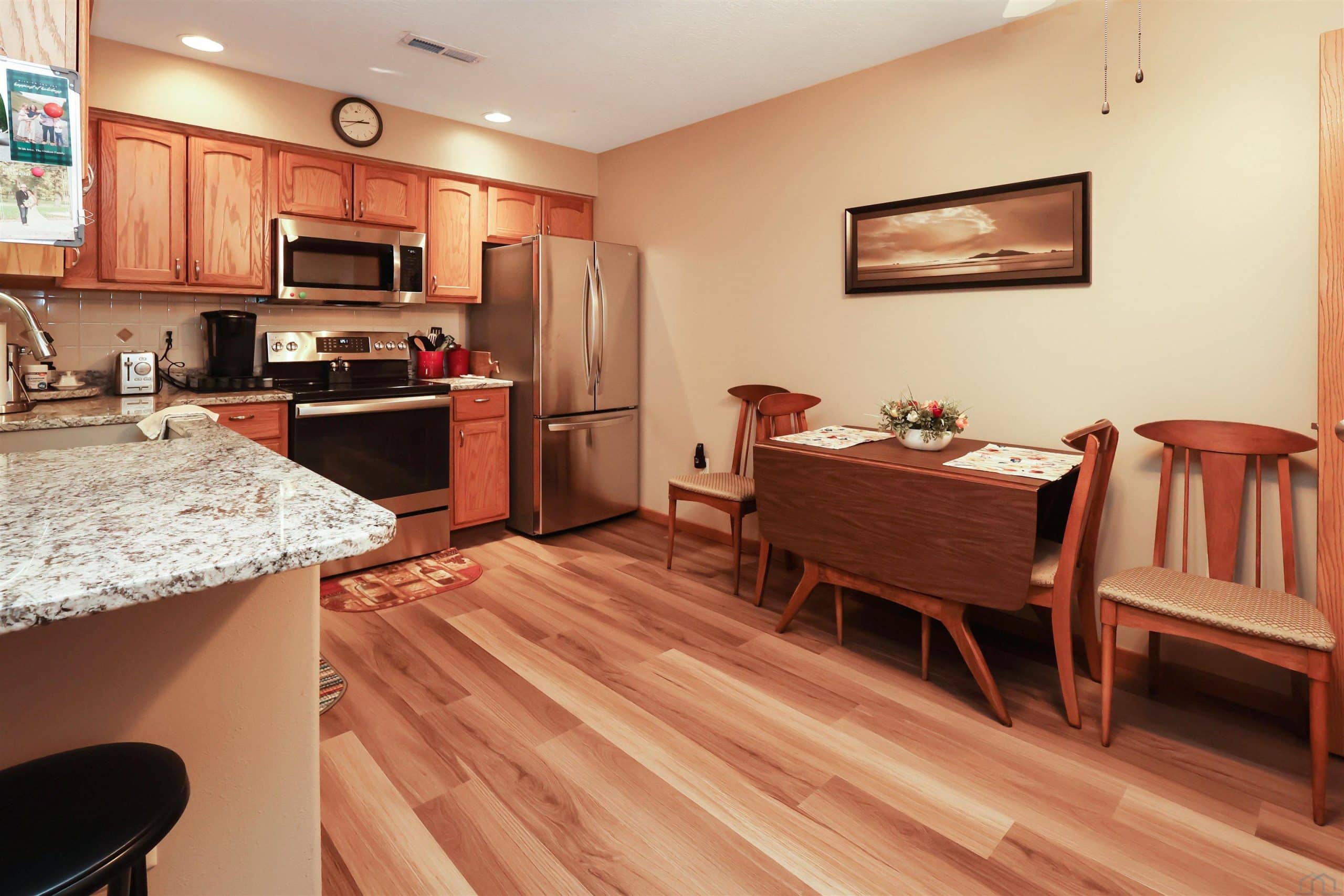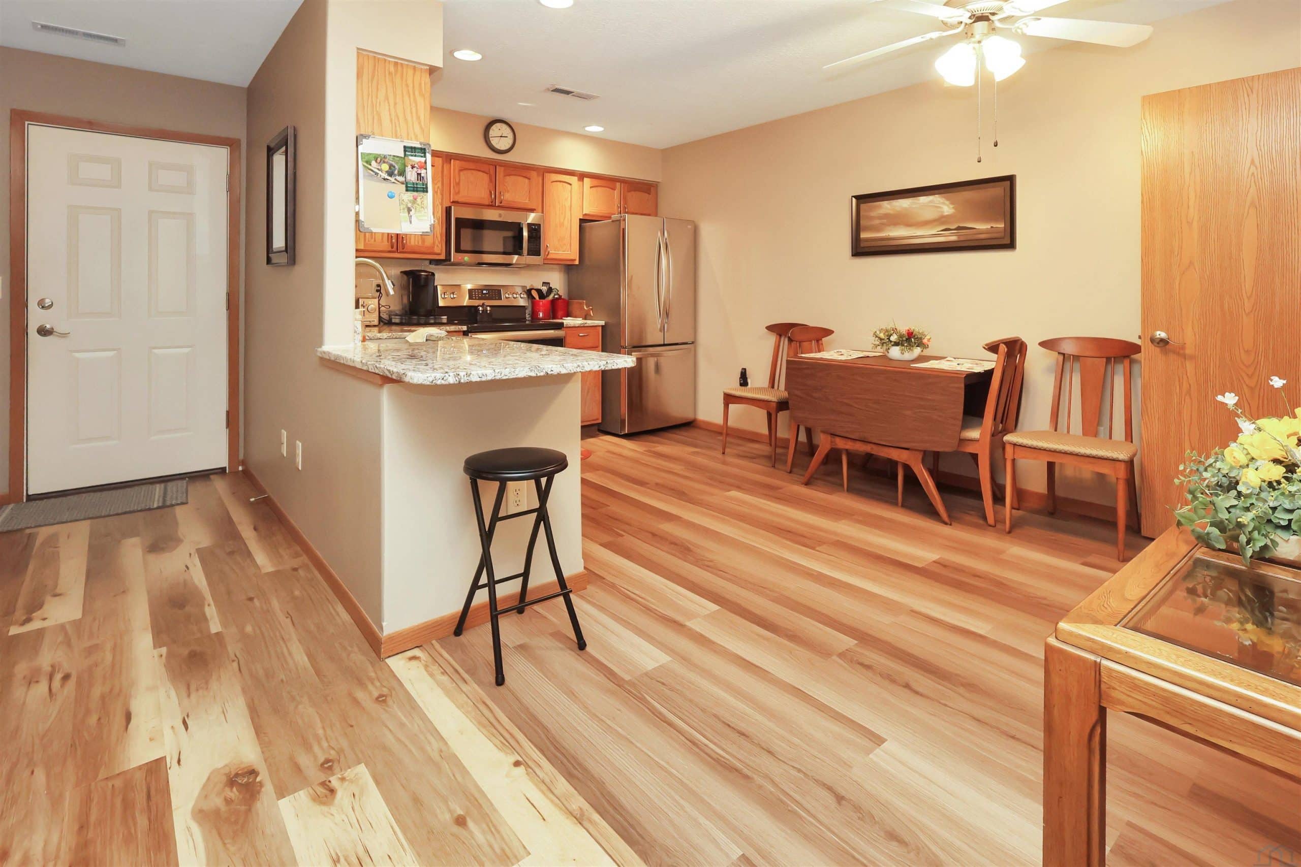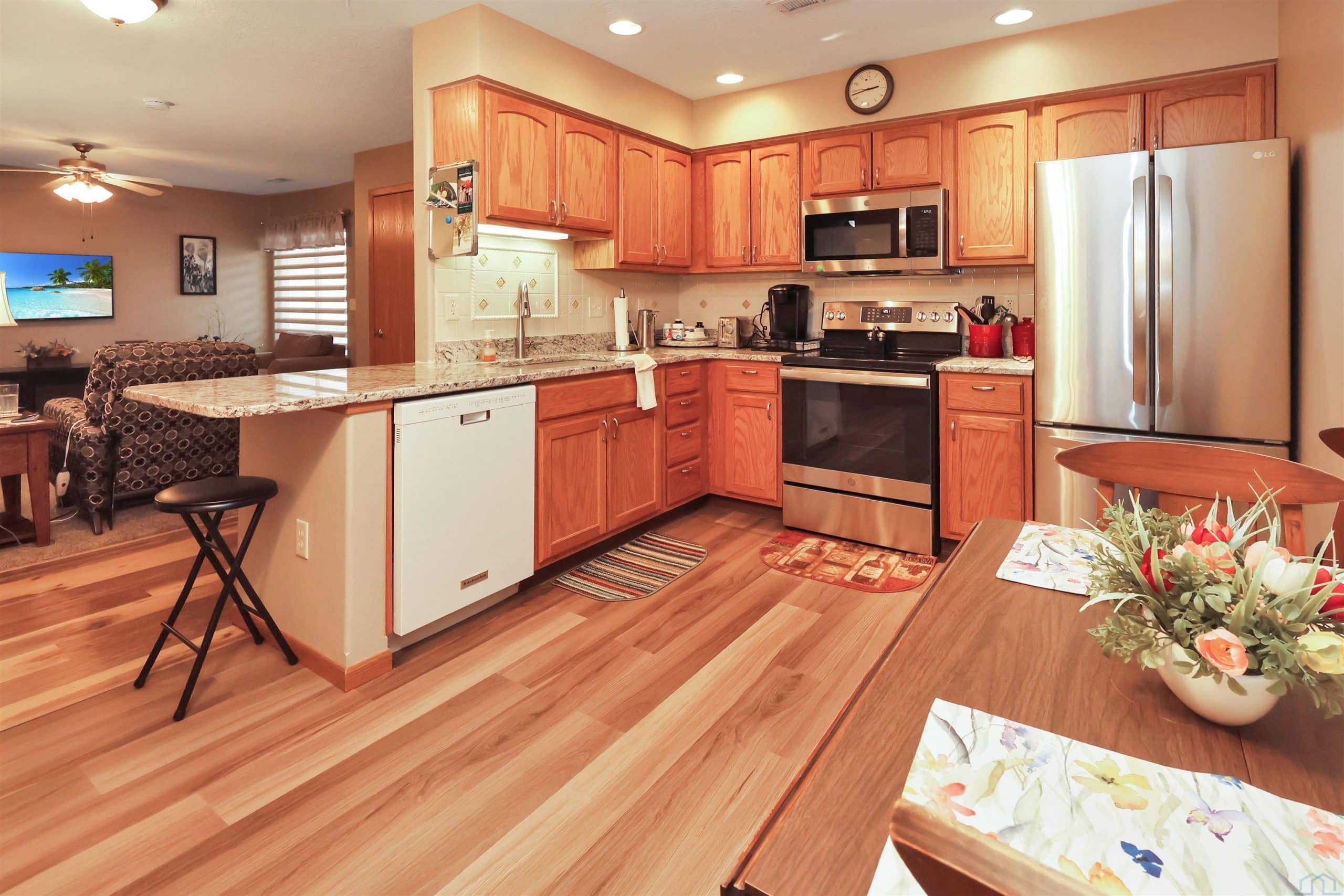 Description: This wonderful 2 bedroom, 2 bath Morningside condo community is an Age 55+ offers zero entry with NO STEPS! ANYWHERE! The HOA fees cover the mowing, shoveling and lawn sprinkling, snow removal (all done for you) and includes the insurance coverage and maintenance of the exterior of the home. You only pay for insurance for your interior and belongings! HOA fee also includes your cable TV use and garbage collection. These units are wheelchair accessible. All of this for $290 a month. The front door has a small patio to allow for outdoor seating on those nice days and evenings. The spacious Family room offers a large front closet. The eat in kitchen includes all of newer stainless steel appliances (Refrigerator, stove, microwave, dishwasher) and granite counters with a snack bar plus a large walk in pantry. The laundry is centrally located just steps from the living area and bedrooms. The newer washer and dryer are also included as well as a water softener and the water heater was new in 2024. The HVAC was new this past year. The 2 Large bedrooms include a primary bedroom with its own 3/4 bathroom and walk in shower and walk in closet. This bedroom has a slider door that takes you out to a patio that offers a quiet place to watch the wildlife in the wooded backyard area where you will encounter some deer and turkey on occasion.The second bath is a full bath with a large window. Al the blinds are new. For community or family events, a covered clubhouse area is available. The condo is 1110 Square Feet and the large double garage is 440 Square Feet. The lot is .18 Acres This condo was built in 2008 and has carpet in the family room and bedrooms and NEW vinyl planking in the kitchen, baths and entry. Come see!