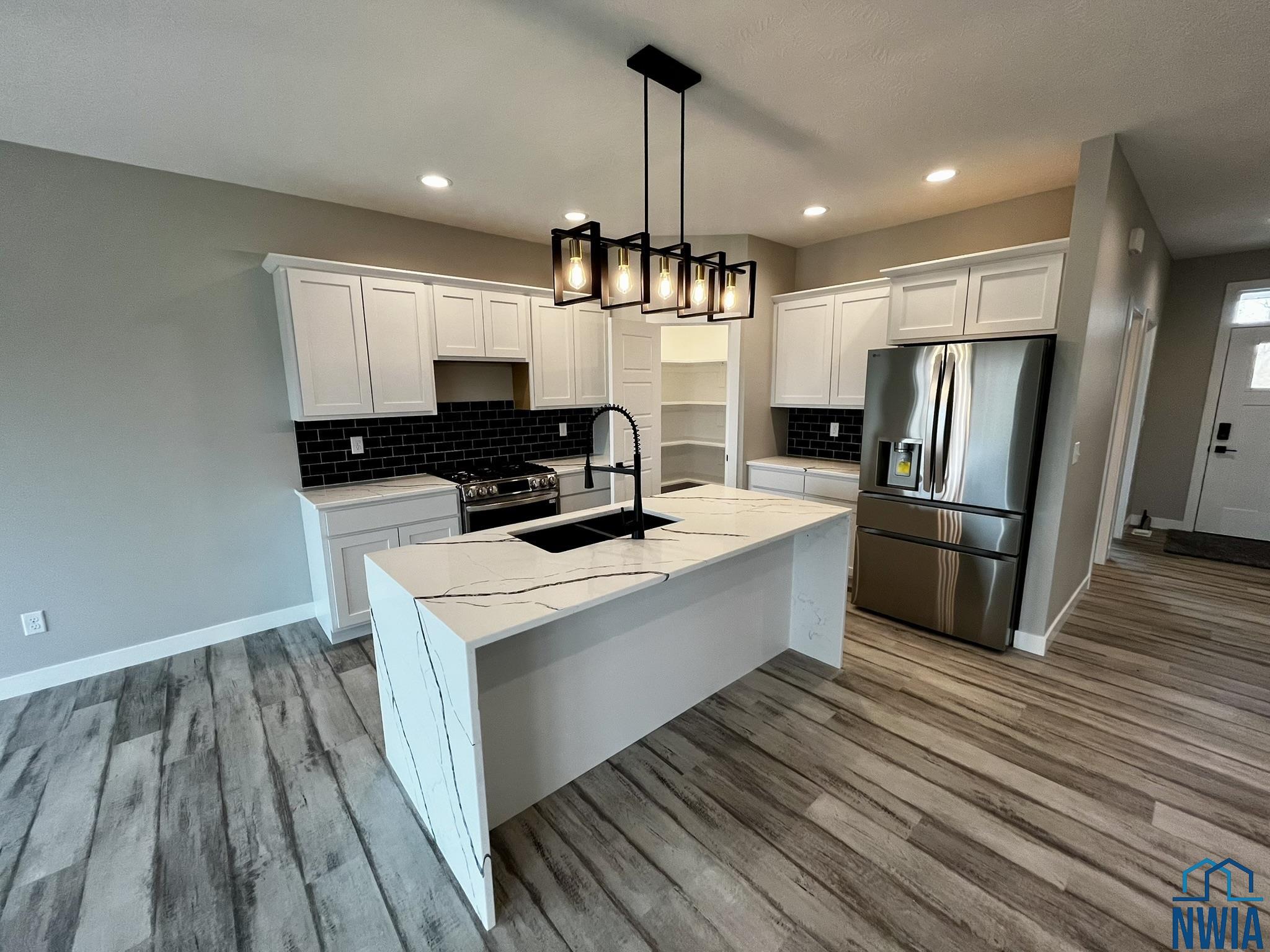 New construction home with 4 bedrooms, 2.75 bath in Elk Pointâs Country Club Estates. This ranch style home has 1,423 square feet on the main boasting an open concept kitchen, living and dining with luxury vinyl plank flowing throughout. The living room has a sleek gas fireplace and ample natural light. The kitchen has a large island, appliances included and a corner pantry. Custom upgrades in the kitchen include a waterfall edge on the quartz countertops, tile backsplash and a gas range The master bedroom has a upgraded carpet, ceiling fan and a walk-in closet. The master bath has a linen storage closet, double vanity, lighted mirror and a step-in shower. The main floor bedroom has a double closet and ceiling fan. The laundry room is also on the main conveniently located just off the garage. The basement is finished with a large family room with luxury vinyl plan, two bedrooms, and a full bath. This basement also provides ample storage in the utility room! Additional upgrades include water softener, oversized deck, sprinkler and sod making this a true custom home! Donât forget about the 3 stall attached garage!