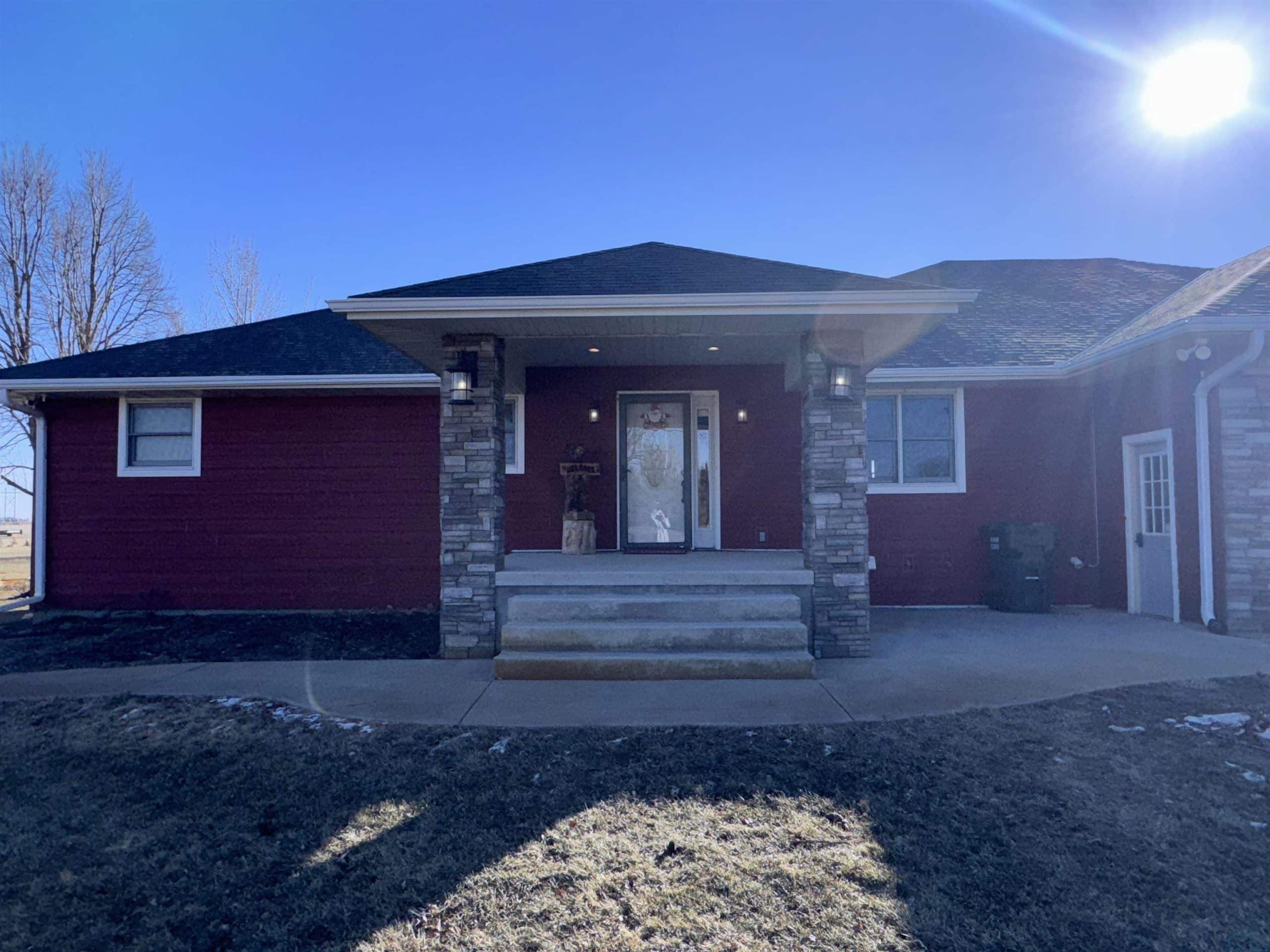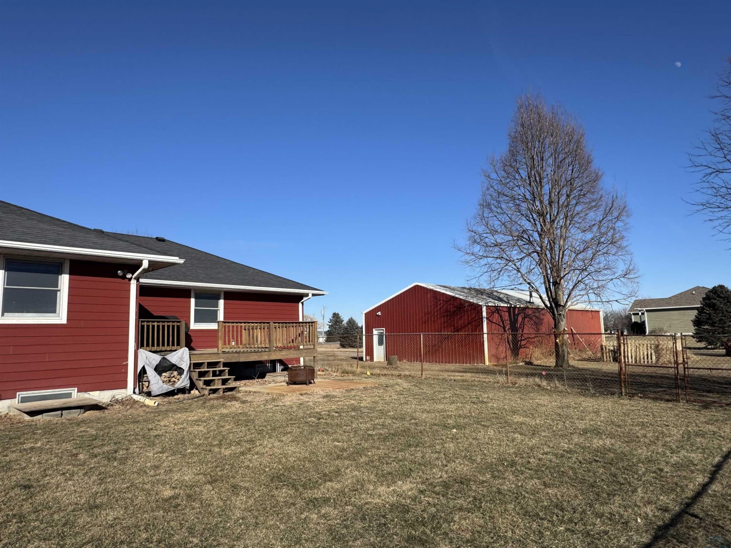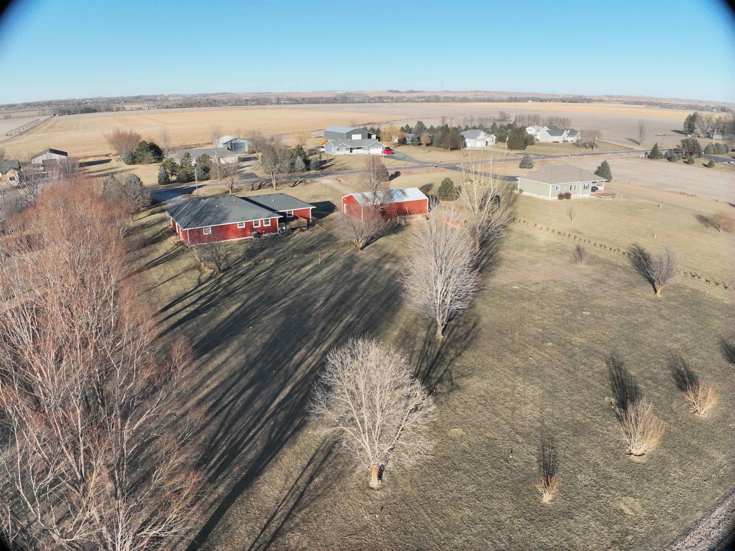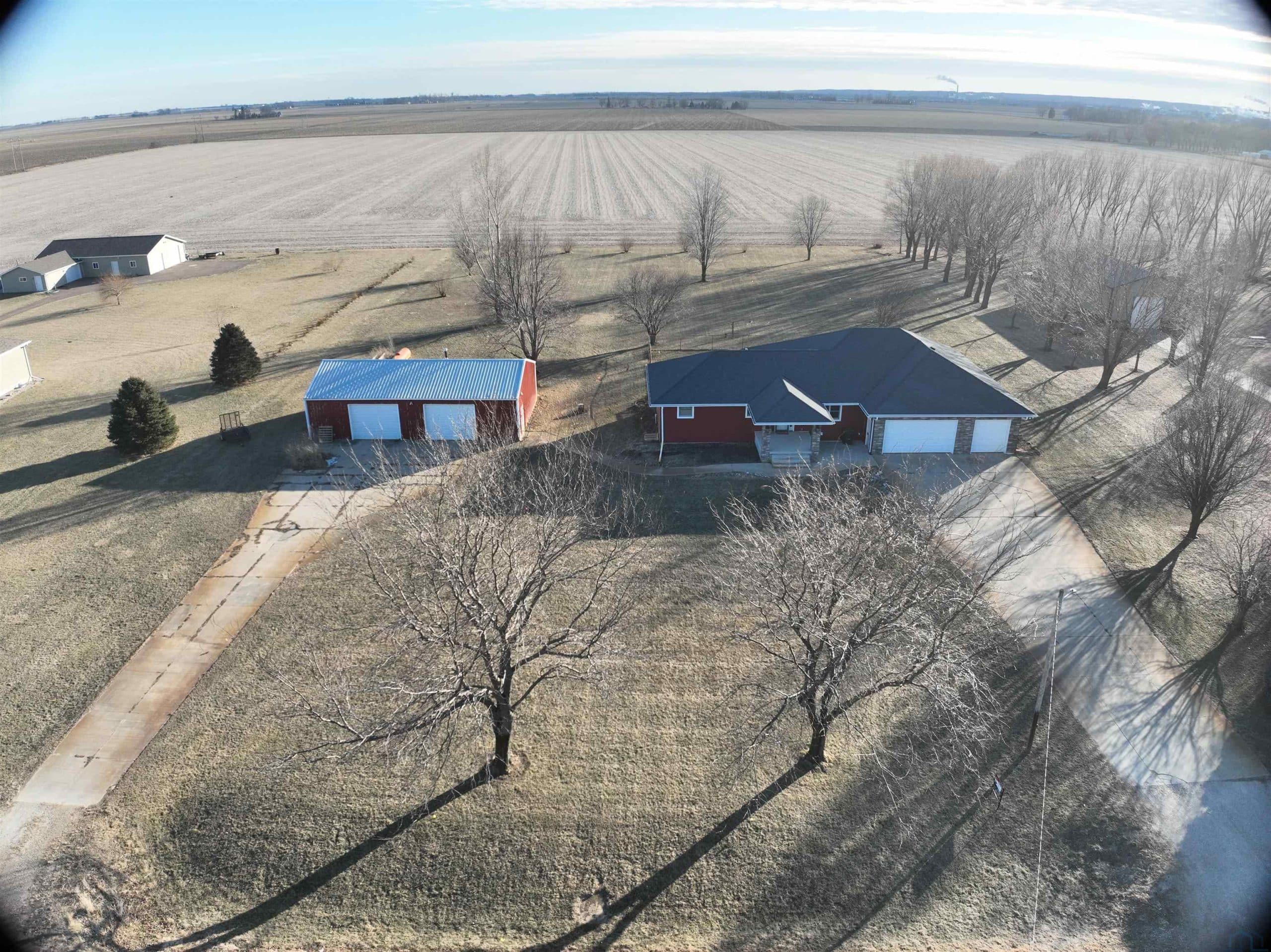Experience the blend of country living and convenience on this stunning 2.2 acreage, located on a hard-surface road just minutes from Interstate 29 and Sergeant Bluff. This impressive 4-bedroom ranch-style home offers approximately 3,600 square feet of thoughtfully designed living space. The main level features two spacious gathering areas, an eat-in kitchen with tile backsplash, and a convenient laundry room complete with cabinetry and utility sink. The primary suite is located on the main floor, along with a separate suite. A sun-filled family room/sunroom at the back of the home features tile flooring and access to the 18â x 14â deck, perfect for enjoying the peaceful acreage views. A half bath completes the main level. The finished lower level offers an expansive living room with a wet bar including sink, dishwasher, and refrigerator. Two additional bedrooms each feature egress windows and double closets, along with a den/office with French doors and egress window ideal for a home office, gym, or guest space. Outside, the property truly shines. The 2.2 acres are fully irrigated by a sprinkler system reaching every corner, fed by a 75-foot well. Enjoy mature apple and peach trees, raspberry bushes, asparagus, raised garden beds, and a partially fenced area just off the large back porch. A 1,000-gallon owned propane tank adds to the propertyâs efficiency. Car enthusiasts and hobbyists will appreciate the 30â x 50â heated shop with a 2-post car lift, as well as the oversized heated 3-stall attached garage.