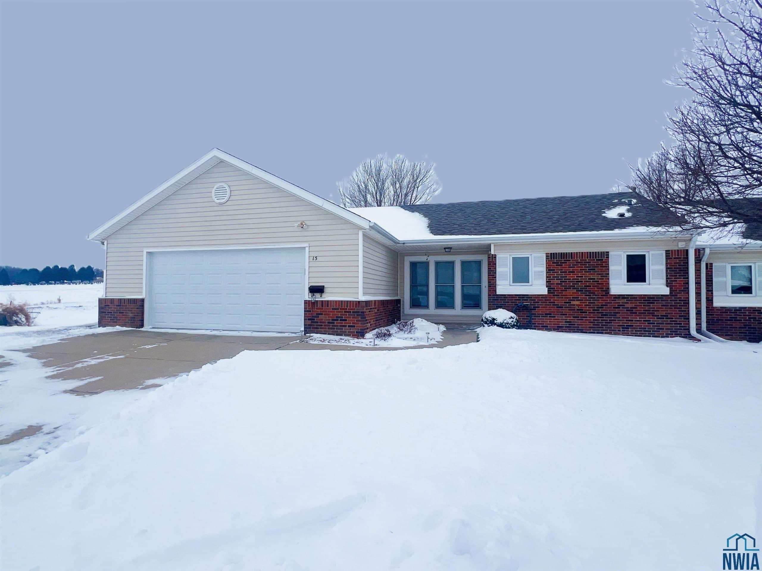 Welcome to this well-designed ranch-style unit offering convenient zero-entry access from the front door and an oversized attached two-car garage. Thoughtfully laid out for comfort and accessibility, this home features two spacious primary-style bedroom suites, each with its own private bathroom. The main primary suite is slightly larger and includes a tub/shower combination with grab bars for ease of use, a linen closet, and a stackable laundry unit conveniently located within the bathroom. The sink is built for wheelchair accessibility. The second bedroom suite boasts a large walk-in closet and a private bath with a step-in shower complete with built-in seating. Enjoy an open and airy living and dining area highlighted by a vaulted ceiling, with patio doors off the dining space that lead outside, perfect for relaxing or entertaining. The kitchen offers generous cabinet space, included appliances, and an additional closet ideal for pantry or cleaning supply storage. The unfinished basement provides excellent opportunity for expansion, featuring an egress window ready for a future bedroom, family room, or additional living space. Additional highlights include: All-electric unit; roof and garage door replaced following hail storm (July 2025); Siding and gutters scheduled for replacement in 2026. HOA dues currently $200/month (subject to change). This is an estate property. Sellers welcome any and all inspections; however, the home is being sold in its current condition. Donât miss this opportunity to own a low-maintenance, accessible home with future potential at 15 Park Village. Midamerican monthly average is $116/mo.