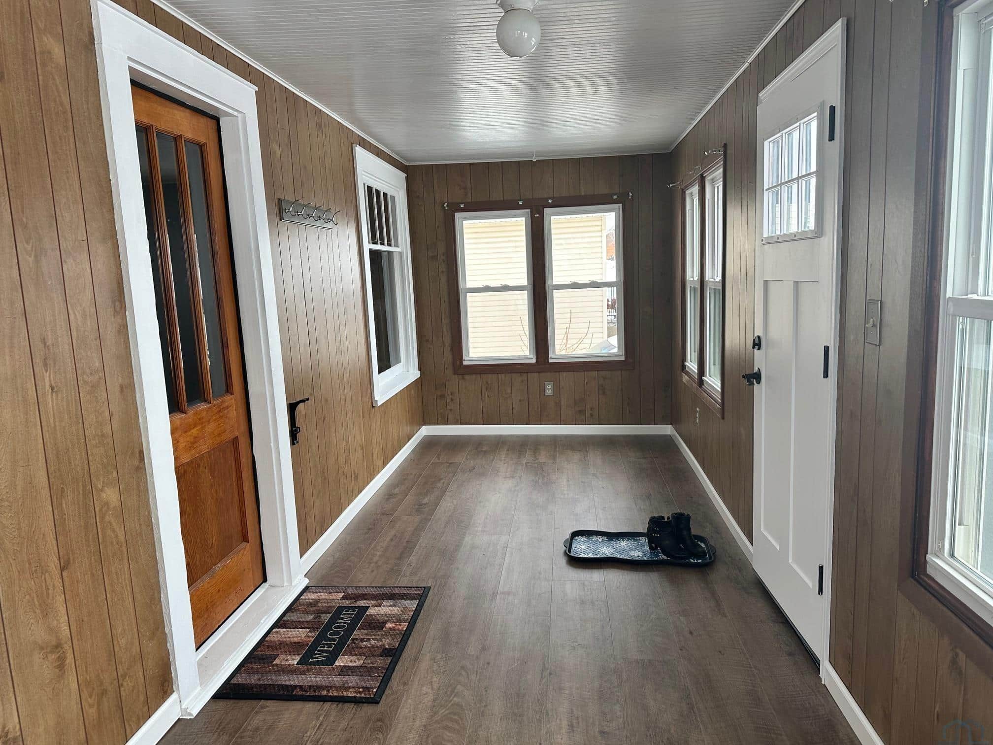 Enter this exceptionally clean property through an enclosed 3 season front porch with natural light for enjoying your morning down time on those warmer days. Continue into the living room/dining room as it welcomes you to all the beautiful woodwork and charming character! The main floor also includes 2 bedrooms and full bath, as well as the kitchen. The upper level is a large open dormer style tastefully done! All flooring is new on the main floor and second level. Basement has a large room in the process of being finished, plenty of storage, laundry, and a 3/4 bath with a shower. The one car garage is located behind the house with a cemented driveway from the street.