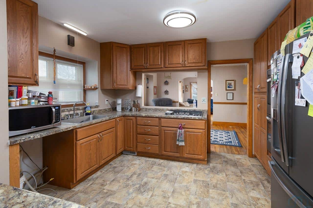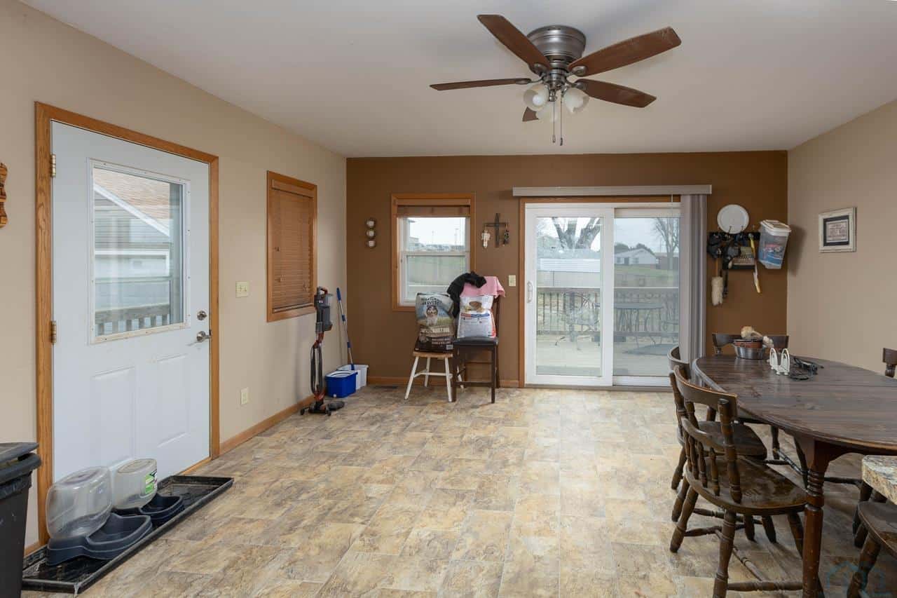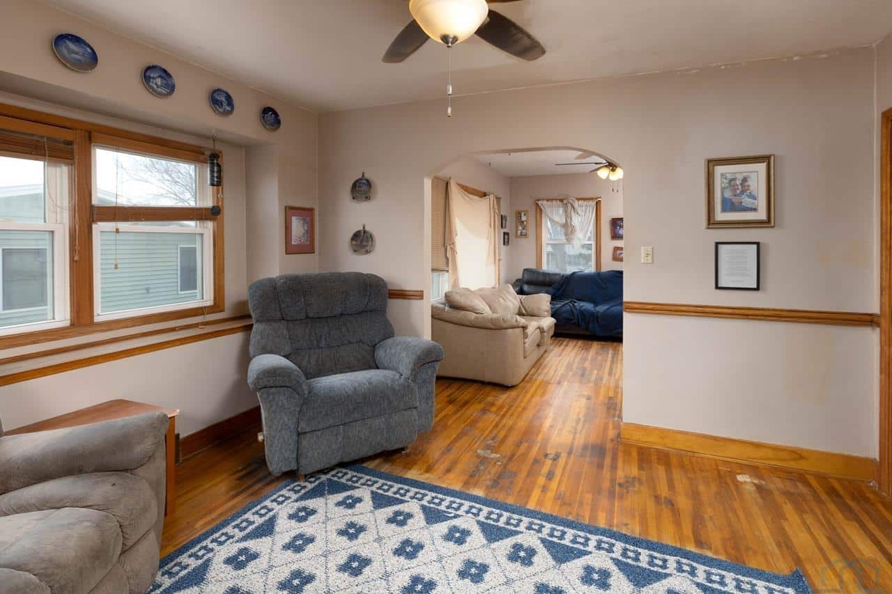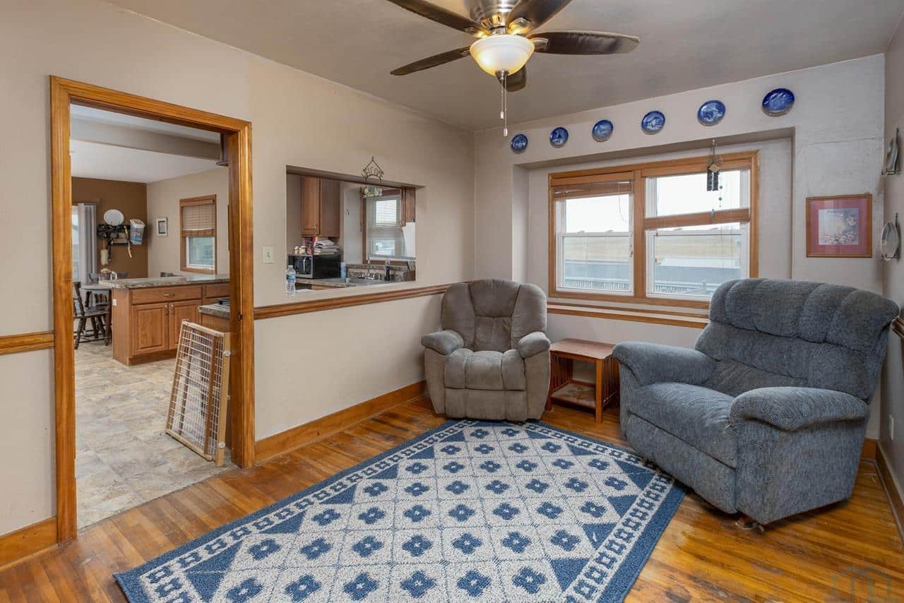 This home is a charming bungalow built in 1947. It has a 2 car detached garage and a large fenced in backyard. This home has some great views of the Iowa hills, and a comfortable backyard deck to enjoy them with a cup of morning coffee. There is also a small deck at the front of the home to invite you home from work each day. Inside the front door is the cozy living room with a brick gas log fireplace to take the chill off our Iowa winters. The dining room has a handy pass through to the kitchen and opens up the space. The eat-in kitchen is a nice space with plenty of windows and sliding glass doors to bring in the natural light. The sliding glass doors open to the rear deck and backyard. The kitchen has a sit at bar, gas cooktop, double ovens and medium oak cupboards. There are three bedrooms with nice closet spaces, a full bath and two linen closets off the dining room. In the basement are 2 non-conforming bedrooms (no egress windows), a 3/4 bath, a large room with a shower stall, a storage room and a laundry/utilities area. This is a sweet home with lots of potential for lots of living! With a little elbow grease, a little paint and a little polish, it will sparkle!