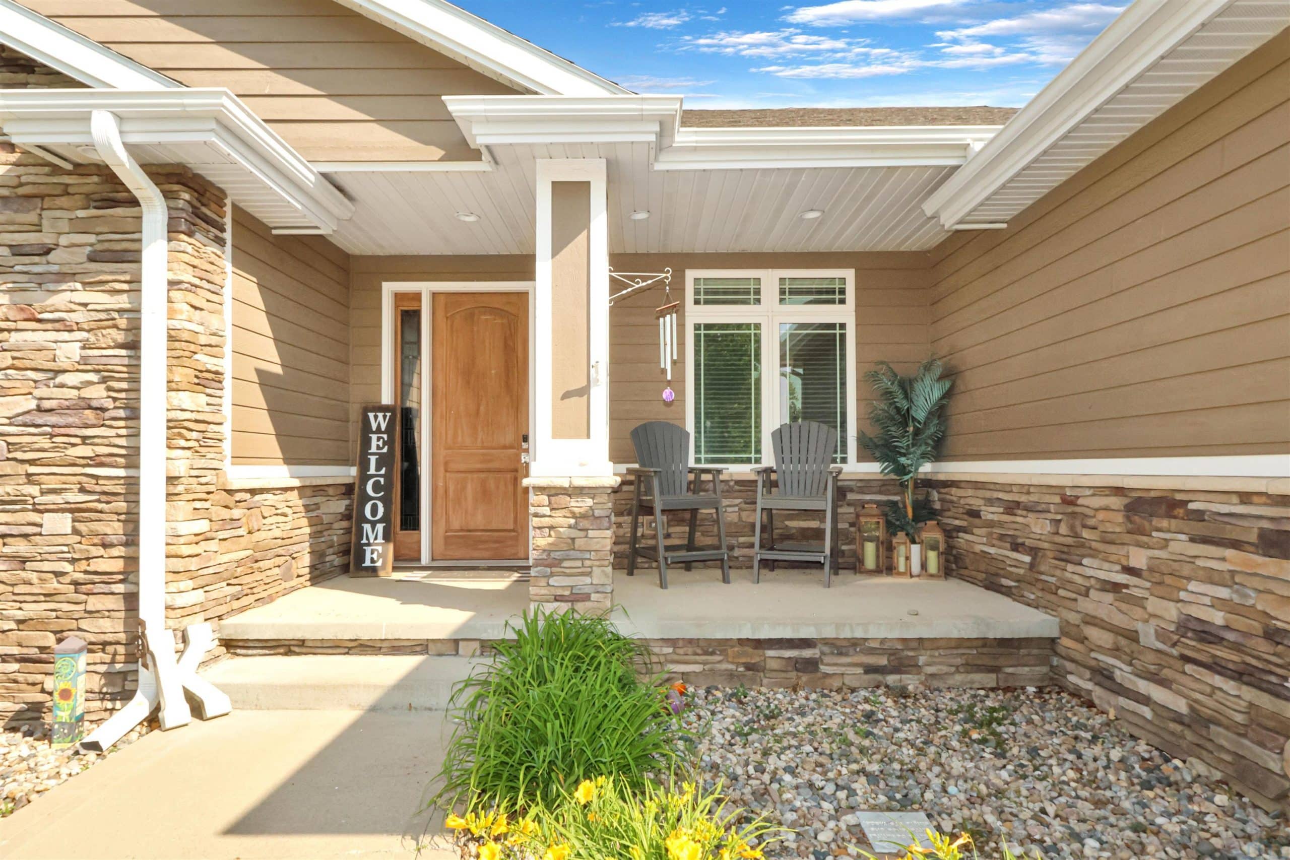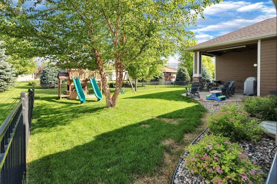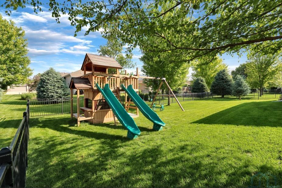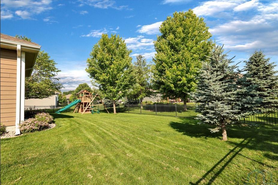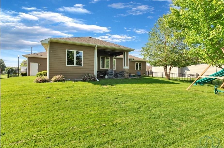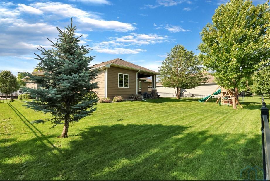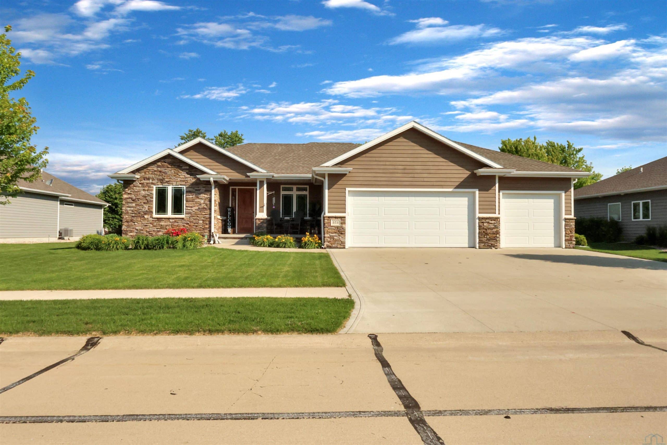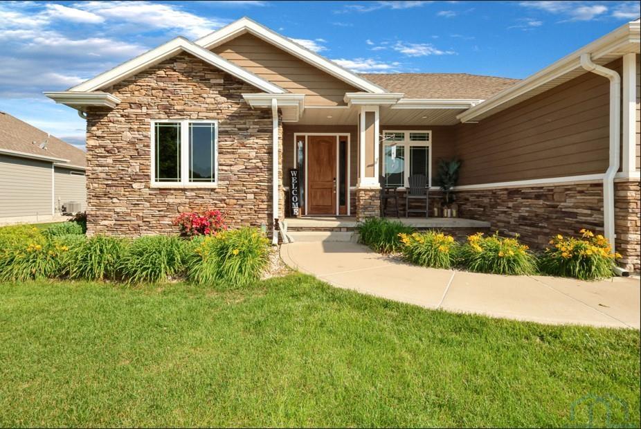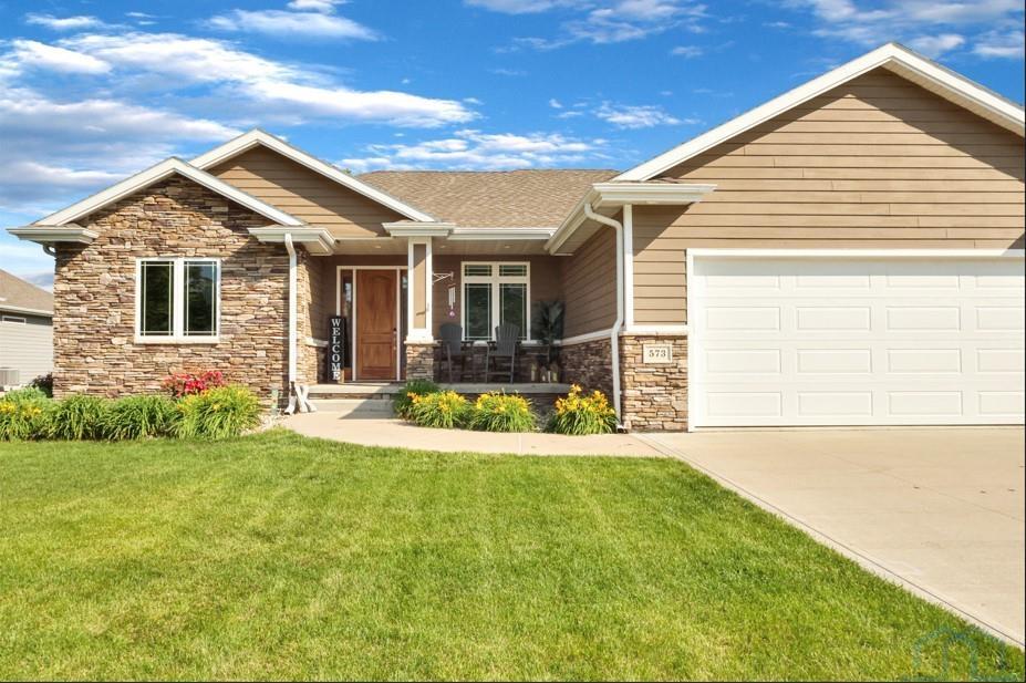 Come home to 573 Sandstone Circle, a 5 bed, 3 bath ranch on one of the most coveted neighborly streets in Dakota Dunes. The home is in The Meadows on a cul-de-sac that is all about community: holiday and birthday gatherings, evening get togethers, and all the action of neighbors who are like family. When you arrive you will appreciate striking curb appeal and a covered front porch. Once inside a spacious foyer greets, and the open-concept living space is cohesive thanks to the living roomâs recently added and perfectly matched hardwoods that now span the entire space. The kitchen was made for entertaining or enjoying meals at home, with granite counters, oversized island, tasteful cabinets, backsplash, and stainless appliances. Off the kitchen is the drop zone with recently added lockers + laundry area. Behind the laundry to the back of the home is the spacious primary en suite, with tray ceiling, upgraded 5-piece bathroom with glass/tile shower, soak tub, dual sink vanity, + plenty of storage; the walk-in closet is well-designed. On the other side of the home are the two commodious spare bedrooms, both with great closets, and the main, full bath. In the basement is a large family room complete with gas fireplace, builtins, and brand new bar space with beautiful quartz countertops, builtin display shelving, & black stainless fridge. Space abounds here in this lower level with ample storage areas, concrete safe room, built-in play space under the stairs, two spare bedrooms, and another full bath. This property just has had permanent holiday lighting installed, offers recently shampooed carpets, fresh paint, 2 new water heaters (both 50-gal), heated/oversized 3-stall garage with built ins, fenced yard, covered patio, negotiable play set, and the benefit of close proximity to the Meadows park & the Country Club. Donât let this beauty get away.