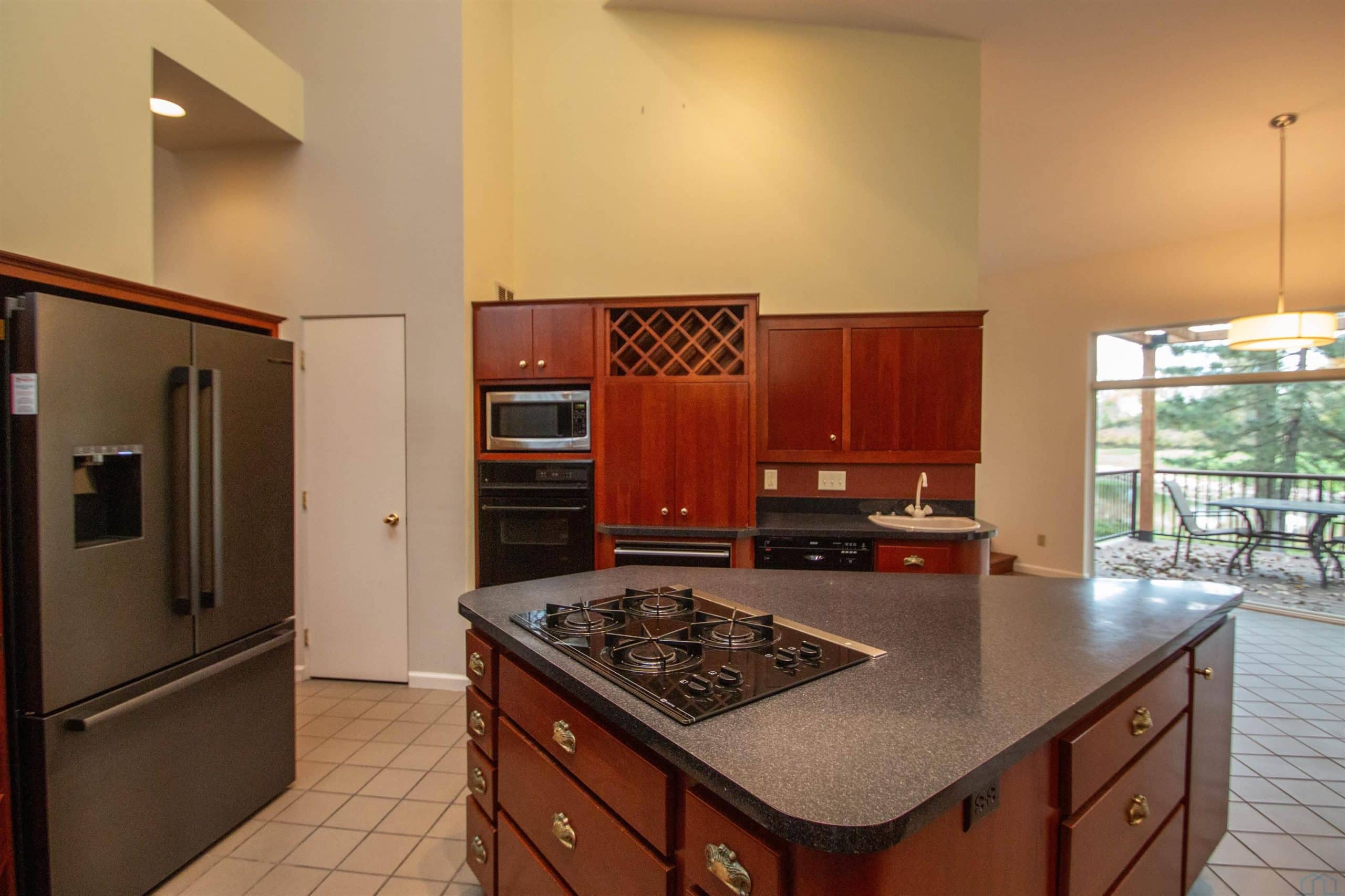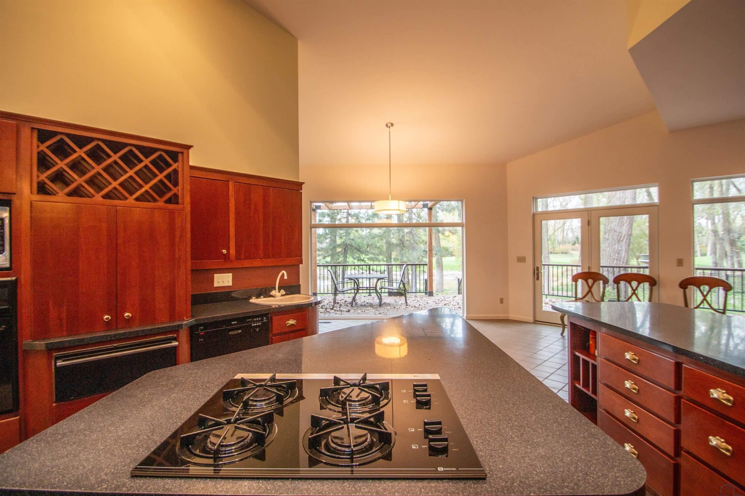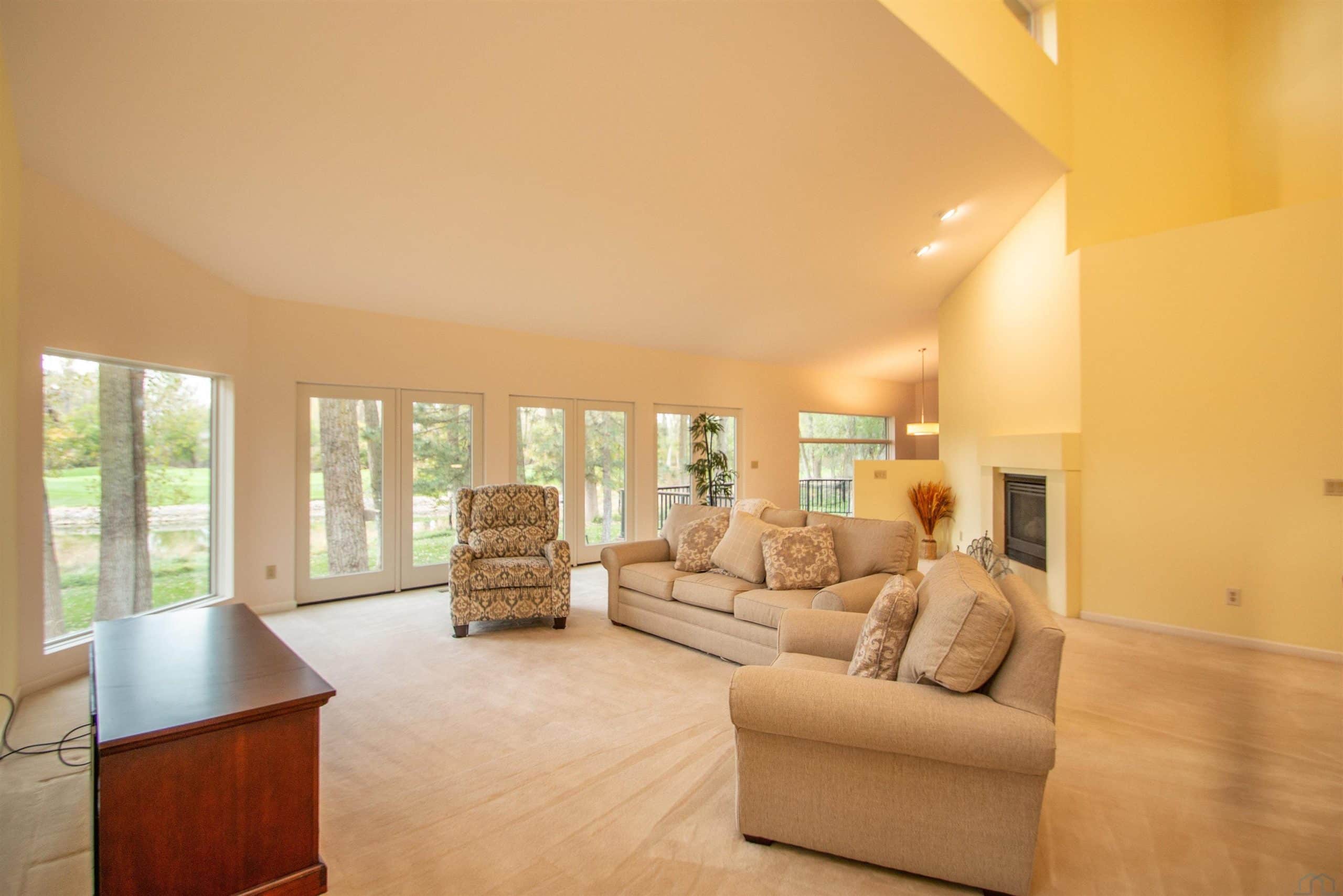 Tucked away on a wooded lot with pond & course views is this unique 1.5 story home with 4 ensuite bedrooms and 3 car garage. As you enter the 2 story foyer you will find an indoor garden area with drip line, 2 staircases, tile floor, skylight and a dbl closet for guests. Pocket doors lead to formal dining area with carpet. Vaulted ceiling in living room with wall of windows to those great views, and gas FP to curl up in front of. Casual dining area off the kitchen has floor to ceiling windows. tile floor and door to Brand New Trex Deck. Kitchen features cherry cabinets with an island, 2 Bosch DW, a gas cooktop, commercial fan, appliance center, warming drawer and a pantry. For more casual living there is a family room with wood floor, wood FP with tile hearth and stacked stone surround as well as a wet bar area. Through French doors to the master suite bedroom with gas FP, built in desk area and door to front of home. Retreat to the bathroom with tile floor, dbl vanity, jet tub, toilet/shower room, 10 x 6 WIC and door to new deck. Other side of home has a bedroom with dbl closet and door to a private deck. The 3/4 bathroom off this bedroom has a single vanity and can be accessed from the hall as well. Going up 1 of the front stairs is a 10 x 4 loft overlooking the entry and leads to a Junior Suite with bedroom with wood floor, door to Juliet balcony with pond view, a WIC and door to dry storage, a full bathroom and laundry area. Going up the other stairs is another 11 x 9 loft area, utility closet, and another Junior Suite with bedroom with carpet, door to Juliet balcony with pond view, a full bathroom with laundry area, 2 dbl closets and skylight. UPDATED FEATURES: Shingles replaced with steel roof 2015, new 6" gutters with leaf guard, New concrete driveway & sidewalk 2025, New Trex deck on the back of the house 2023. New Pella windows main floor and second floor on the west side of house. FP: 2 gas-1 wood. 3 HVAC.