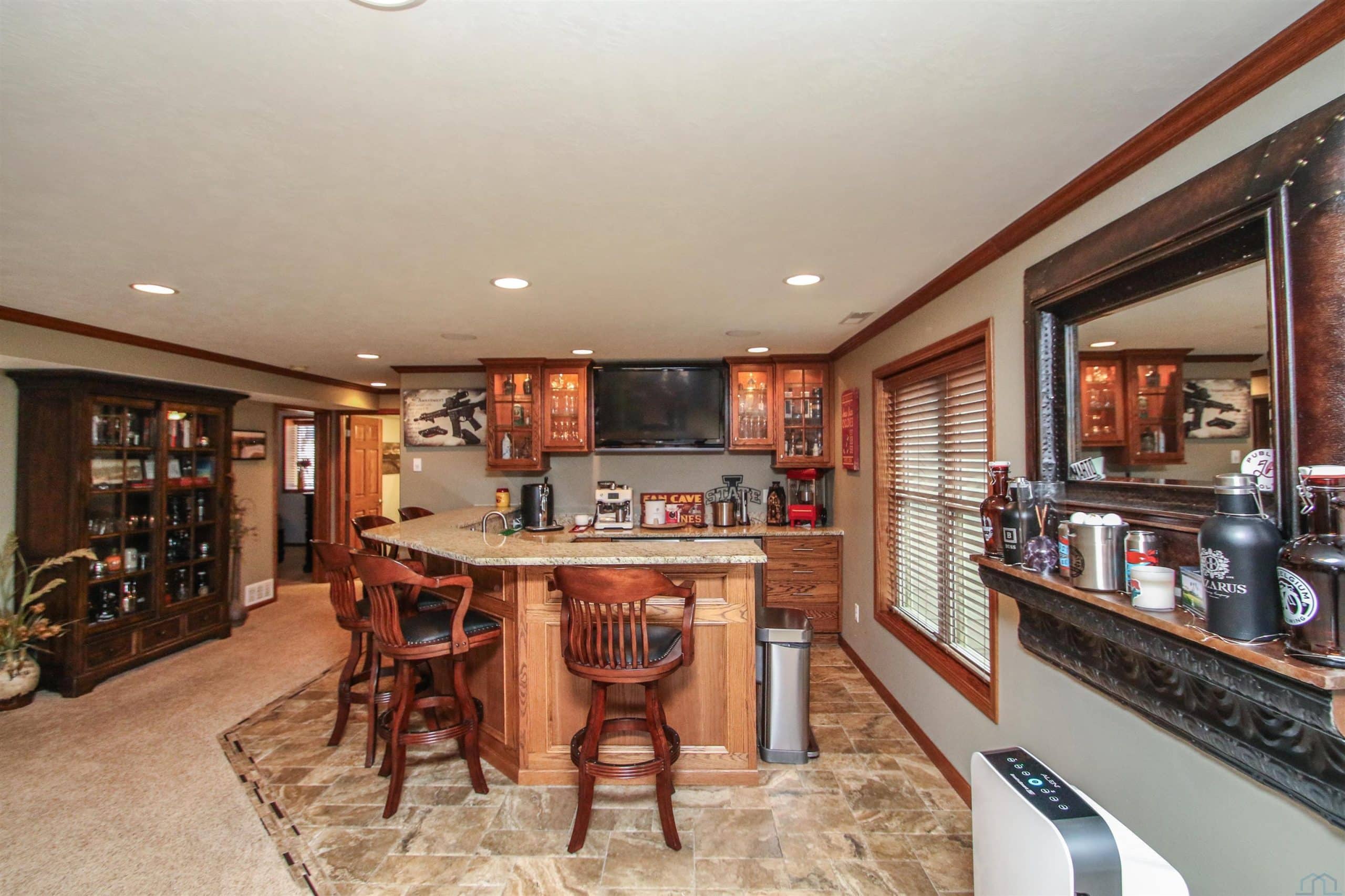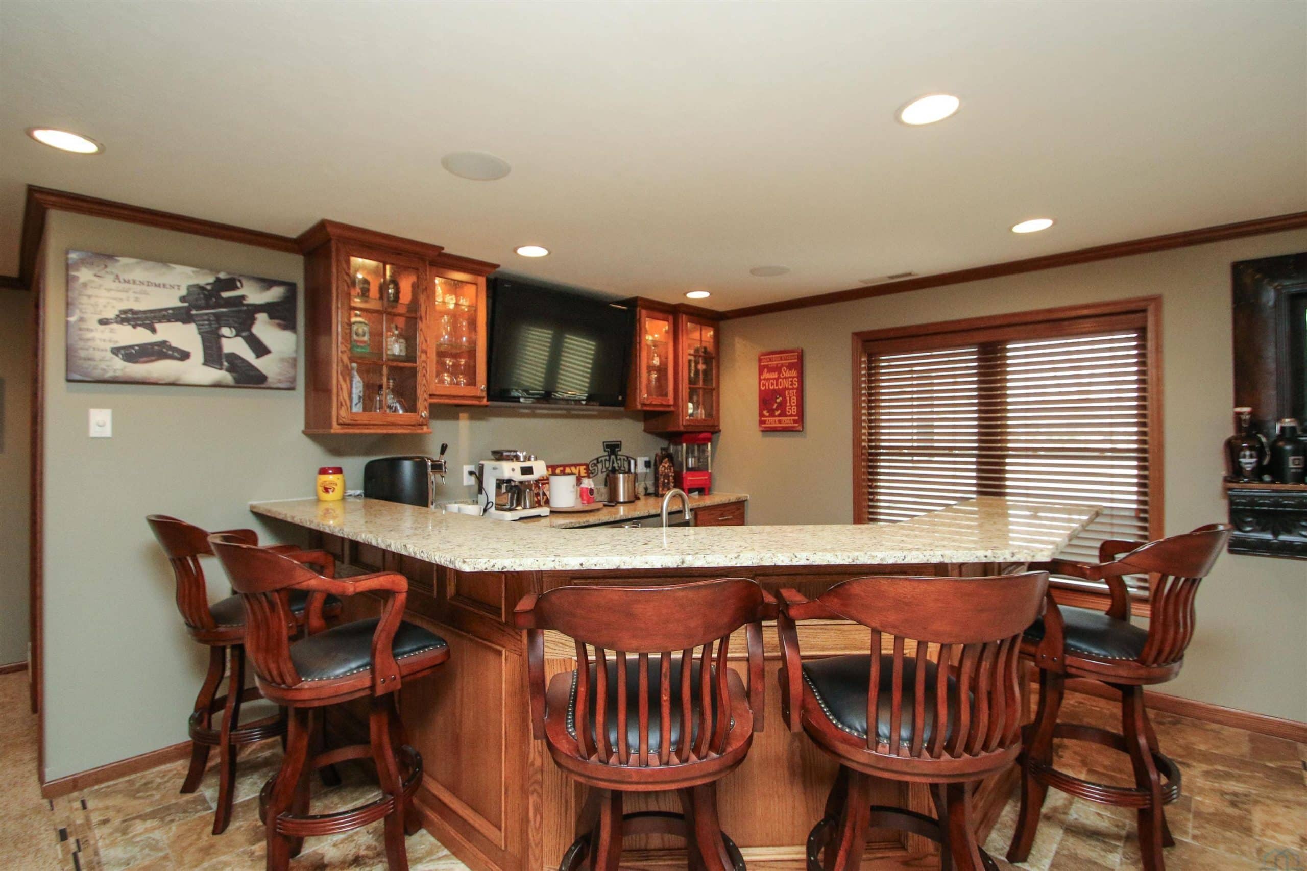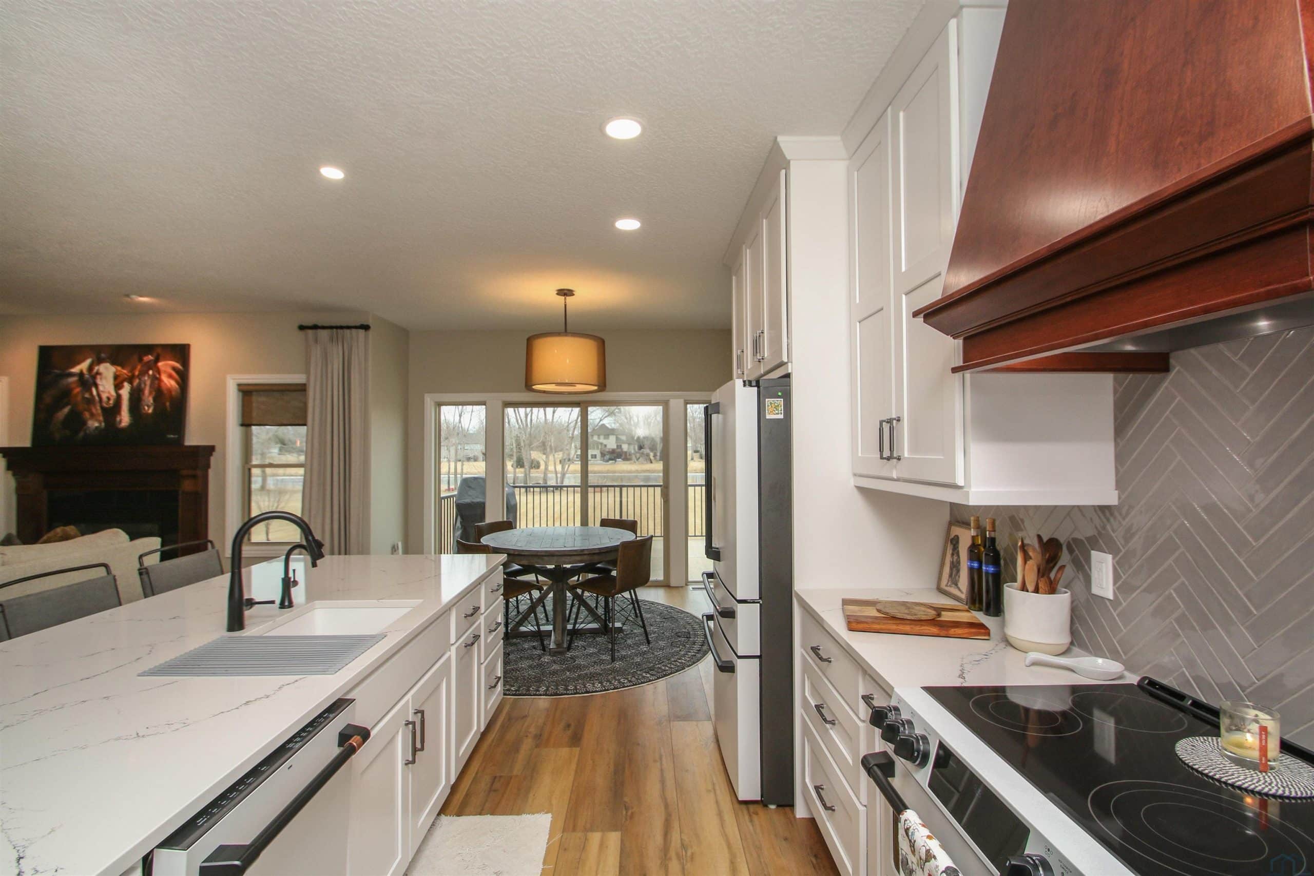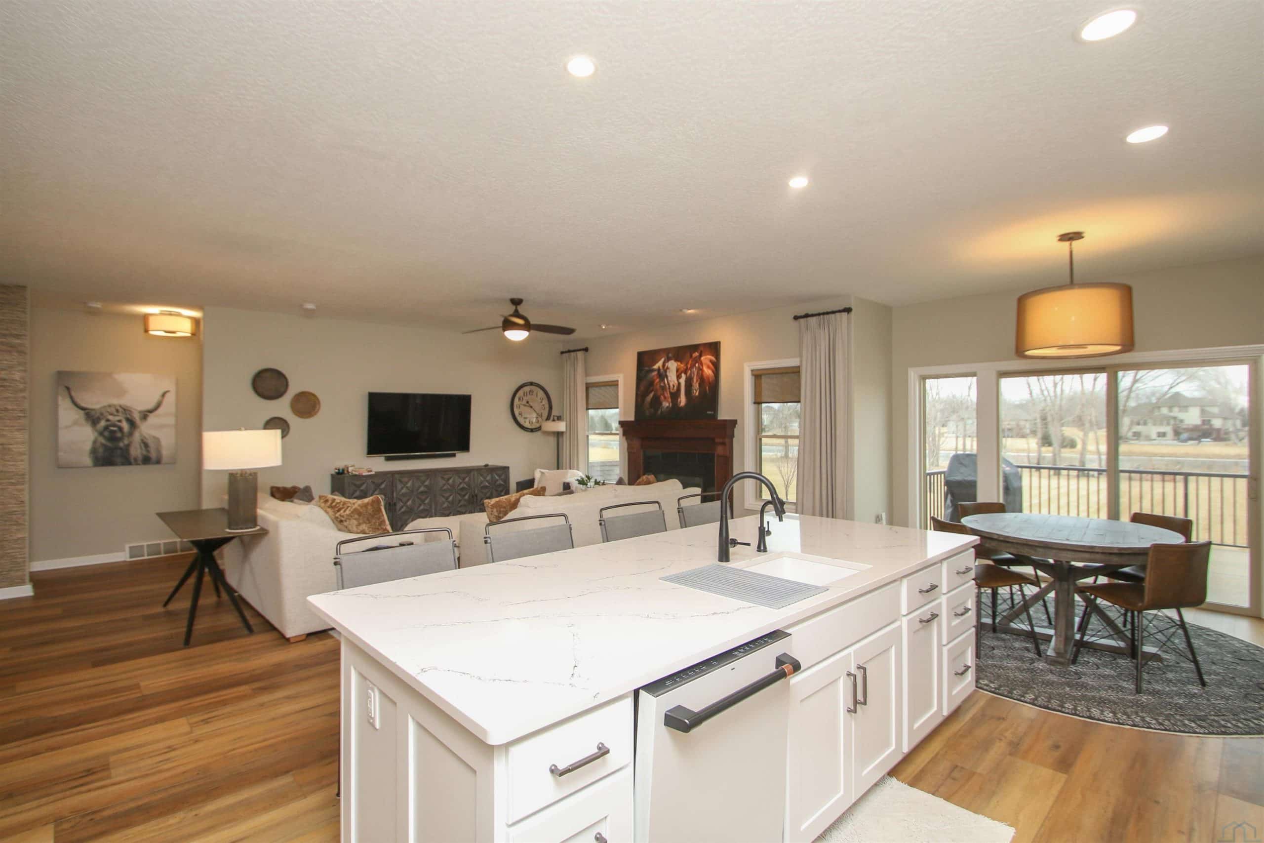 Prepare to be impressed by this beautifully updated home in the desirable Wynstone community with the pond in the back yard. With 5 bedrooms, 3.5 baths, and a thoughtfully designed open layout, this home offers the perfect balance of comfort, style, and scenic views. The welcoming foyer features engineered flooring and an elegant staircase, setting the tone for the quality found throughout. The great room is warm and inviting with a gas fireplace and flows seamlessly into the fully updated kitchen and dining area. The 2023 kitchen renovation showcases custom cabinetry, quartz countertops, stylish backsplash, center island, and GE Café appliances, ideal for both everyday living and entertaining. Step out from the dining area onto the concrete deck and enjoy peaceful pond views. A flexible family room offers space for a sitting area, playroom, or media room. The split-bedroom design provides privacy, while the primary suite features a beautifully remodeled bath with tile flooring, quartz double vanity, and a spacious walk-in shower. New trim, baseboards, and six-panel doors add a crisp, finished look throughout. The finished walkout lower level expands your living space with a large rec room, custom bar, corner fireplace, full bath, and two additional bedrooms, perfect for guests or hobbies. Walk out to the level backyard and enjoy direct pond access, covered patio, underground pet fence, and attached 10 x 12 storage shed. Additional highlights include an oversized 2-car garage, zero-entry access, permanent Christmas lighting, heat pump with dual gas system, Marathon water heater, and durable shingles (2014). Meticulously maintained and move-in ready, this exceptional home offers comfort, updates, and beautiful waterfront living.